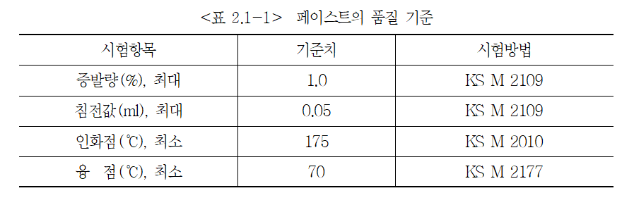 ⑵ 페이스트는 테이프를 도복하기 전 금속표면을 보호하고 테이프와 강관 표면의 접착력을증가시키며 품질기준은 <표 2.1-1>을 만족해야 한다.