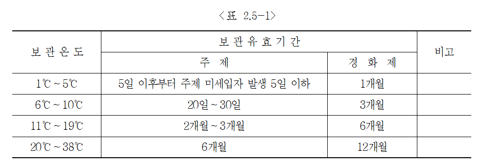 ⑵ 도료는 PE용기에 보관하고, 직사광선은 피하며, 따뜻하고 통풍이 잘되는 건조한 곳에 보관한다. 사용 전․후 보관 적정온도는 20℃~38℃이며, 보관기간은 6개월~1년 이내이다.2액형 도료의 창고보관 또는 취급중에 제품의 온도별 유효기간은 <표 2.5-1>과 같다.