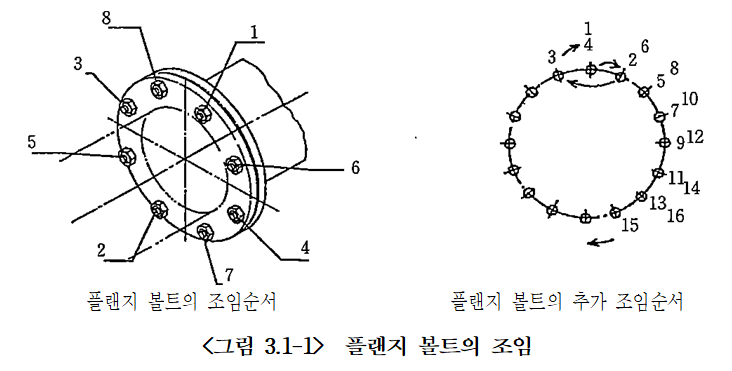(16) 플랜지볼트의 조임은 개스킷을 균등하게 압축하도록 대칭위치의 방향 순서로 조인다.