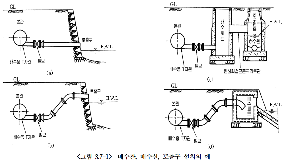 (4) 토출구 근처의 호안은 방류수로 인하여 세굴 또는 파괴되지 않도록 견고하게 축조하여야한다. 배수(排水)관로의 토출구 부근이 방류에 의하여 침식 또는 파괴될 우려가 있는 경우에는 콘크리트, 그물망, 사석 등의 방호공을 설치한다. 일시적으로는 배수시에 강판말뚝을 한 줄로 세우거나 목재의 뗏목을 띄우는 등으로 방호하는 경우도 있다. 또한 배수실을철근콘크리트구조로 하여 토출구에서 분출수의 에너지를 감쇄시키고, 그 월류구의 폭을 가능한 크게 하여 유속을 줄여서 방류하는 방법도 있다.