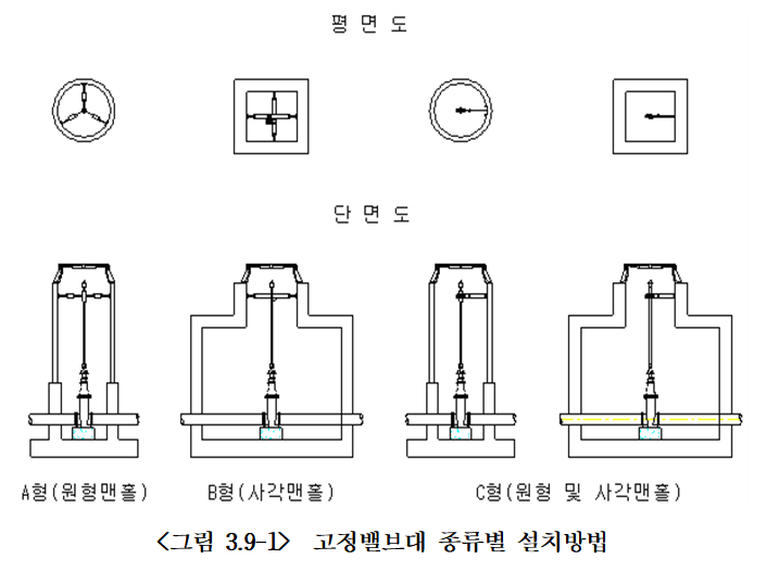 (1) 밸브실 상단에서 고정밸브대 캡이 30cm 미만이 되게 설치하여야 하며, 이 때 밸브실 뚜 껑을 열고 닫는데 지장이 없어야 한다.