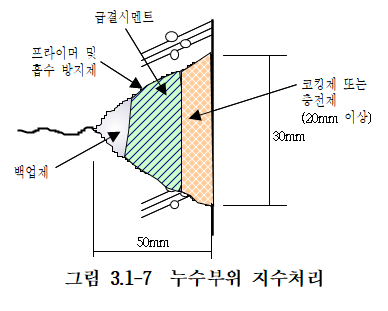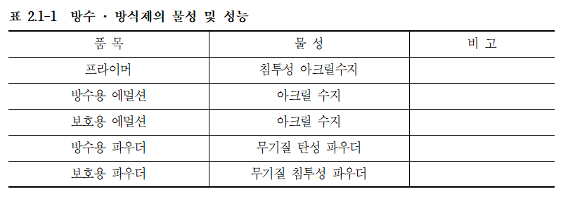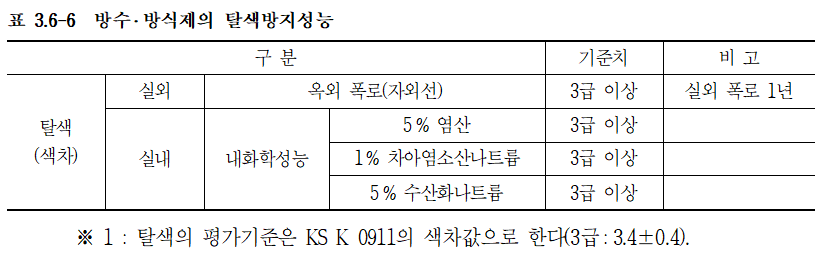 *1. 상도용 방수제는 상수도구조물의 환경조건에 의해 부식될 가능성이 있을 때 별도의 방식조치를 취해야 하고, 이때의 사용재료는「수도법」상의 위생안전기준에 적합한 것이어야 하며 시공 후 먹는물에 용출되지 말아야 하고 내화학성이 커야 한다.