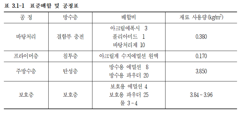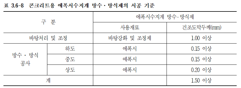 이 시방서 KCS 57 40 15 방수공사 3.6.2 콘크리트용 에폭시수지계 방수·방식의 ⑶ -①에 따른다.