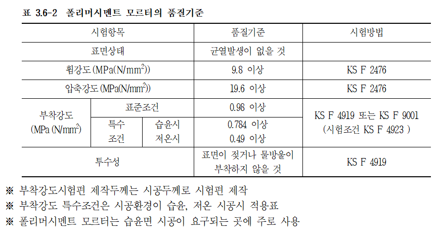 *2. 폴리머 분산제는 무기질 분체의 물성, 유동성, 발수성 등을 개선할 목적으로 사용한 유백색의 에멀션, 폴리디스퍼젼, SBR라텍스 등을 말한다.
