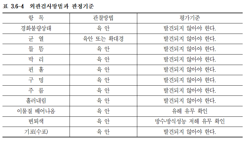 외관검사는 방수·방식층 전면을 대상으로 육안으로 하며, 미세균열 등에 대해서는 확대경을 사용하여 상태를 검사한다.