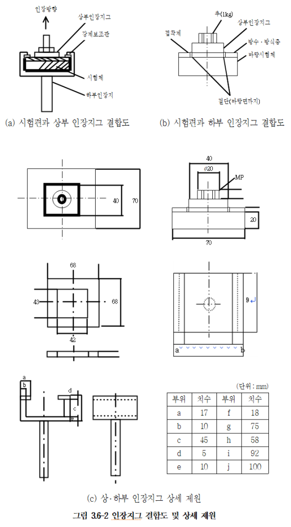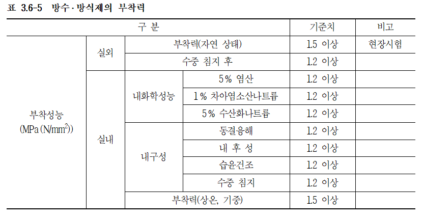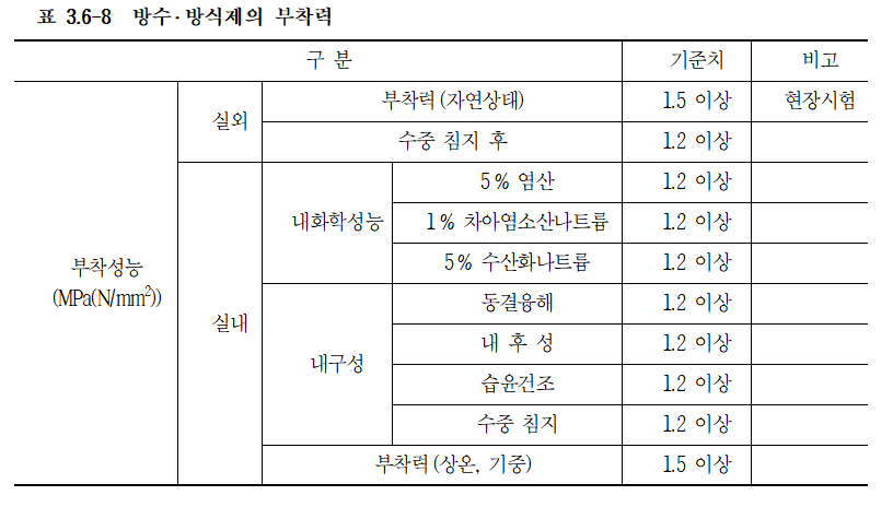 상수도구조물에 사용되는 방수․방식 재료는 누수방지 및 콘크리트의 보호를 위하여 각 구조물에 작용하는 수압에 대해 장기내구성을 유지하기 위해서는 양호한 부착력을 보유하여야 한다. 상수도 구조물에 사용되는 방수․방식층의 부착력은 “표 3.6-8”의 품질조건을 만족해야 하며, 부착성능에 대한 실외시험(자연상태)이 필요할 경우 시공현장에서 직접 시행한다.