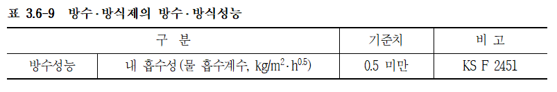 상수도에 사용되는 방수․방식 재료는 누수방지 및 콘크리트의 보호를 위하여 각 구조물에 작용하는 수압에 대해 방수성능을 가져야 한다. 상수도구조물에 사용되는 방수재료의 방수성능은 “표 3.6-9”의 품질조건을 만족해야 한다.