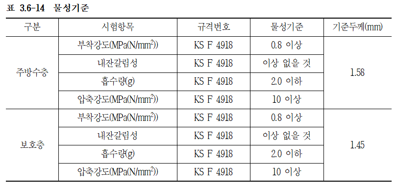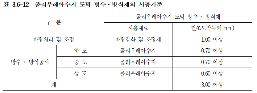 상수도구조물의 각 시설물의 환경조건에 대해 시공한 방수·방식 재료의 두께는 “표 3.6-12”의 시공규정두께 이상으로 도포되어야 한다.