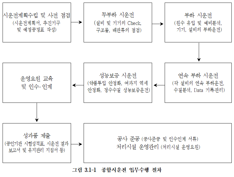 <그림 3.1-1>은 정수시설 건설 후, 종합시운전 업무 수행에 따른 통상적인 절차를 나타낸 것으로 일반적으로 종합시운전은 설비의 사전검사 및 설비별 무부하시운전, 부하시운전, 연속부하시운전, 성능보증시운전, 운영요원교육 및 인수인계 등의 업무를 수행하며 단계별 수행업무에 대한 사항은 <표 3.1-1>를 참고하여 각 단계별 세부절차 수립을 통해 수행한다.