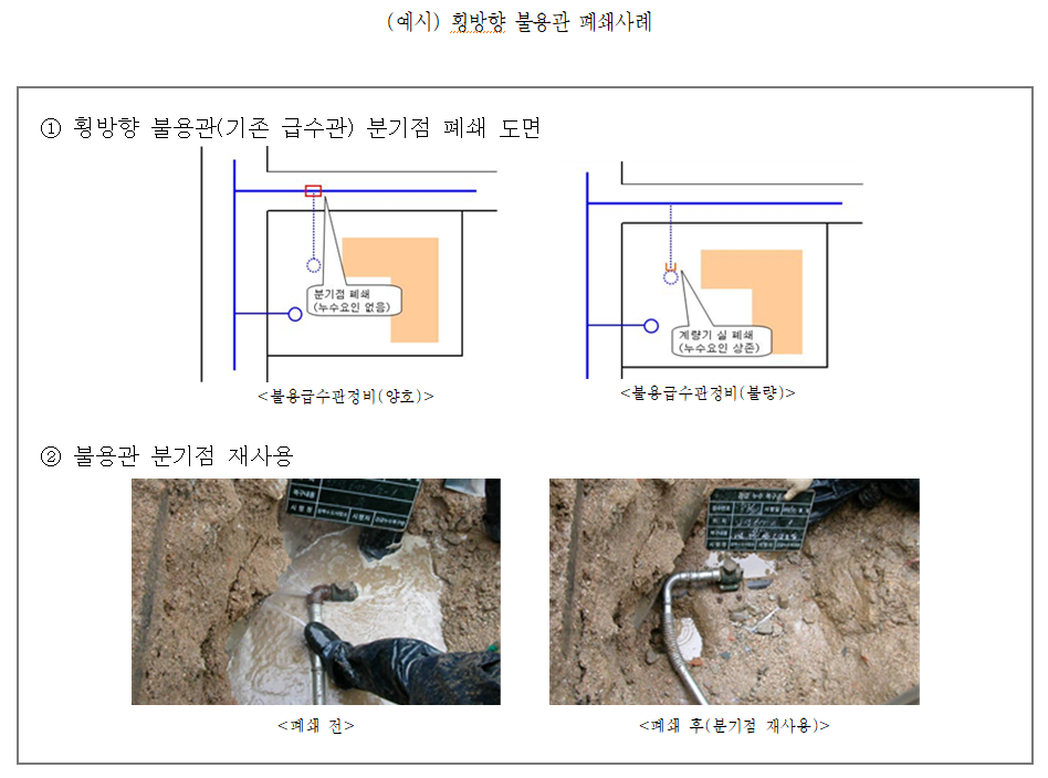 ① 구경 50mm 이하의 불용관은 누수방지 새들 설치, 분기점 재천공 후 급수관 개량이 되도록 한다.