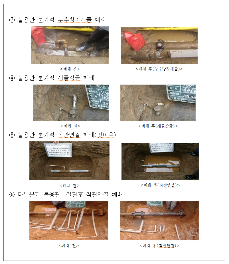 ⑵ 종방향 불용관 발견시는 관을 절단하여 물이 흐르는 방향에 우선 밸브를 설치한 후 반대쪽 수요가는 본관에서 분기하여 급수공사를 시행하여 단수 민원을 예방하고 분기점을 찾아 폐쇄하여야 한다.