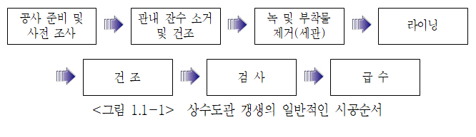 ⑶ 관 갱생공사는 구조적으로 아직 사용가능한 주철관 및 도복장강관의 내부 스케일을 세관공사로 제거한 후 기존 도장재를 제거하고 고품질의 라이닝을 위한 표면처리를 한 후, 관 내면에 보호피막 등을 형성시키기 위한 라이닝 등을 시행하여 관의 사용기간을 연장시키는 공사이다.