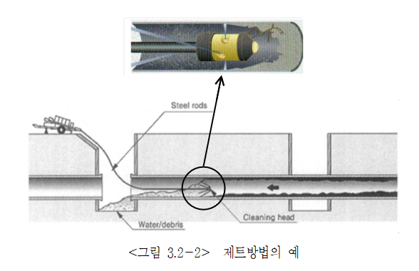 ① 관경이 100~3,000mm의 상수도관 내 퇴적된 이물질 및 슬라임을 제거하기 위해 회전 노즐을 이용한 초고압 워터젯 또는 스크레이퍼를 이용하여 제거한다. 이때, 초고압 워터젯의 압력은 관내상태에 따라 조절하여 사용한다.