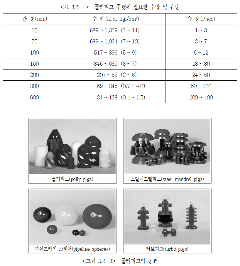 ⑷ 폴리피그 방법은 특수우레탄의 포탄형 물체를 관로 세척용 투입구 또는 맨홀을 통하여 관내에 장착하고, 압력이 있는 압력수를 이용하여 주행시킴으로써 관내에 부착된 스케일 및 이물질을 제거시키는 방법으로 기존관 및 신설관 세척에도 사용된다.