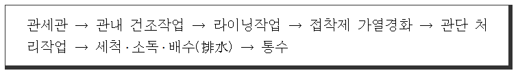 다. 세관이 완전하지 못한 상태나 완전하게 건조되지 못한 상태에서 라이닝을 할 경우 라이닝 재료의 분리이탈현상 때문에 관마찰손실수두 증가 등 역효과가 발생될 수 있으므로 주의하여야 한다.