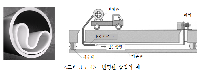 ⑶ 삽입관으로는 일반적으로 덕타일주철관 및 도복장강관이 사용되고 있으나, 기존관의 관경이나 굴곡에 따라 적용조건이 다른 경우, 삽입관의 관종이나 구경 등을 검토한다.