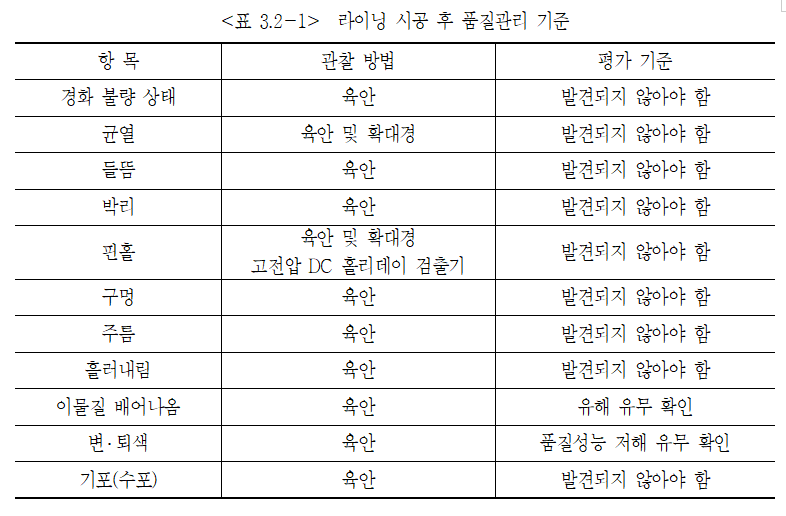 나. 라이닝의 시공 후 외관품질은 육안으로 확인하여 다음 <표 3.2-1>과 같은 기준을 만족하여야 한다.