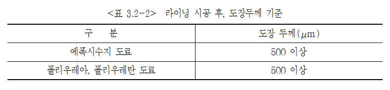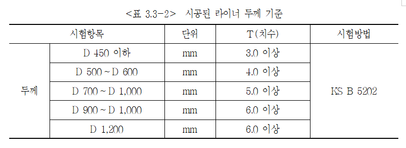 다. 라이닝 두께는 다음과 같이 도장하며 현장 시공오차는 –10% 이내를 유지토록 하여야 한다.