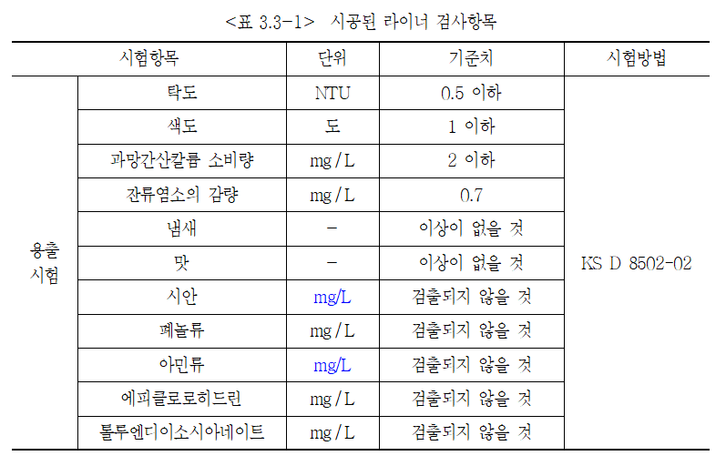 일반적으로 시공현장에서 직접 채취한 시험시편에 대한 시험으로써 시공된 라이너의 구조적인 물리적 특성파악과 적합성 여부를 판단하기 위해 단기시험으로 인장강도, 굴곡강도, 굴곡탄성률을 측정하여 아래 표에 준한 시험 결과치를 발주자에게 제출하여야 한다.