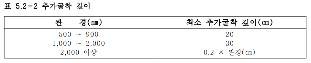 <표 5.2-2>와 같이 관저에서 추가 굴착하고 양질의 토사로 굴착 바닥면에서 관저 5㎝까지는 소요다짐도로 충분히 다지고, 관저까지 잔여 5㎝는 느슨하고 평활하게 포설하여관로에국부적 응력 집중이나도복장부의손상이 없도록하여야한다.