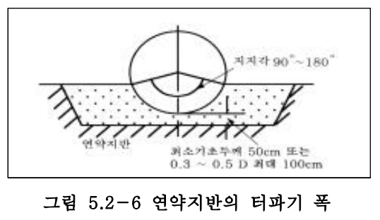 – ② 관두께 결정시 설정된 토질조건에 부합하지 않는 연약지반의 경우 <그림 5.2-6>와 같 이 관저 50㎝ 또는 관경의 0.3~0.5배(최대 100㎝ 이하)의 깊이로 추가굴착하고, 관저 의 폭은 관경의 2~3배로 굴착하여 양질토를 포설 다짐하거나, 또는 지반을 효과적으 로 보강하여 관로의 안정성을 확보할 수 있는 기초처리 공법을 이용하여야 한다. 치환된 양질토사의 다짐 기준은 최소한 관두께 결정시 고려된 조건 이상이어야 한다.