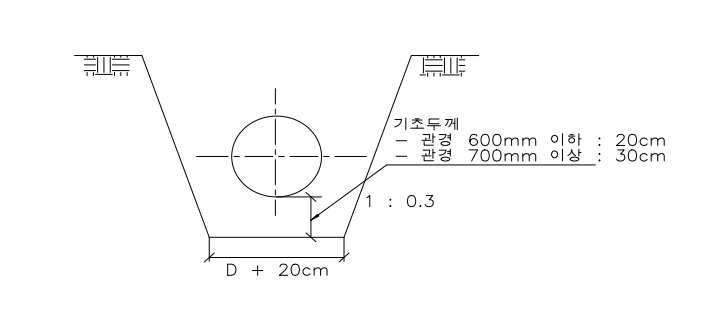 가. <그림 5.2-7>과 같이 관저 30㎝(관경이 600㎜ 이하의 경우 20㎝) 깊이로 추가굴착 을하여야하고, 관저의 폭은 “관경+ 20㎝” 로굴착하여야한다.