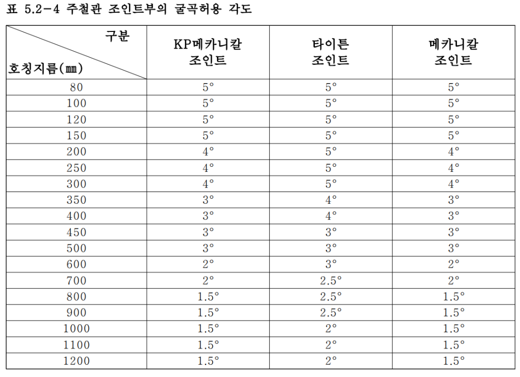 – ① 덕타일주철관의 각종이음의 굴곡허용각도는 <표 5.2-4>과 같이 1~5°이며, 이 각도 범 위내의 관로는지반침하에순응할수있다.