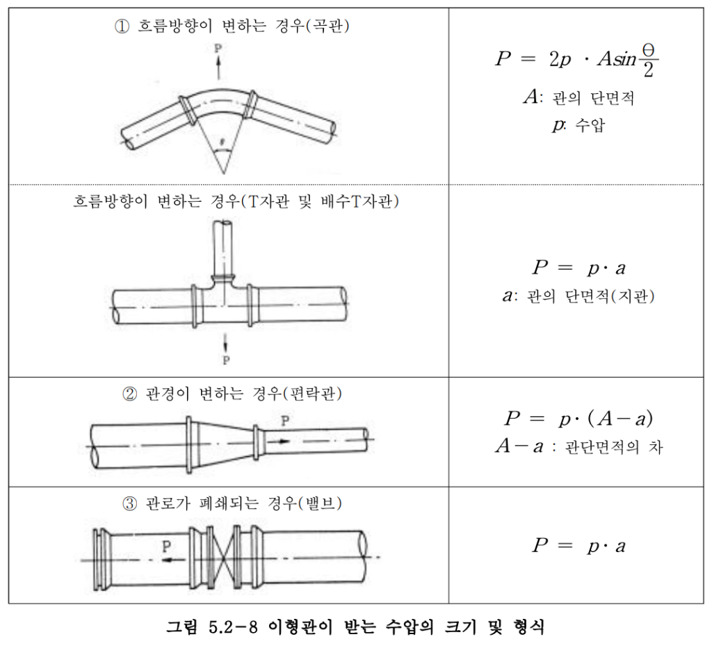② 곡관이나T자관등의이형관이 받는 수압의크기및 형식은<그림5.2-8>과같다.