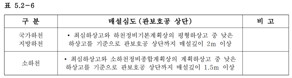 ① 하상매설관로의 매설심도는 하천정비기본계획상의 평형하상고와 실측한 하천의 최심 하상고 중 가장 낮은 하상고를 기준으로 관보호공 상단까지 최소 2.0m 이상확보하여 야 하며, 하천관리시설(계획 중인 시설 포함)에 지장을 주지 아니하여야 한다. 단, 소 하천의 경우 최심하상고와 소하천정비종합계획상의 계획하상고 중 낮은 하상고를 기 준으로 관보호공상단까지최소1.5m 이상확보하여야한다.