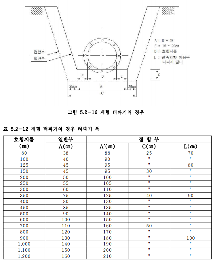터파기 폭은 관저면을 기준으로 하여 “관경 + 20㎝(한쪽여유폭) × 2″를 기준으로 <그 림5.2-15>과같다.