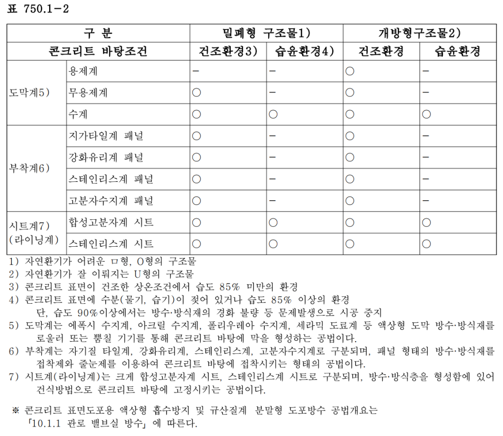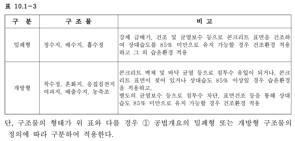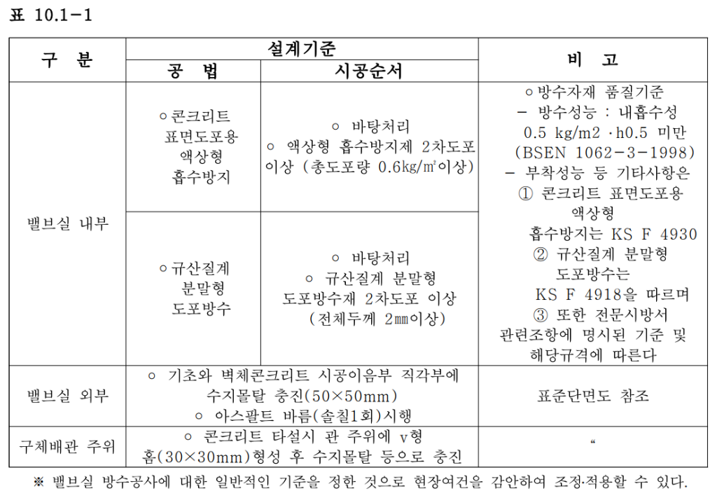 정수장 수처리구조물별 방수/방식설계기준은다음과같다.