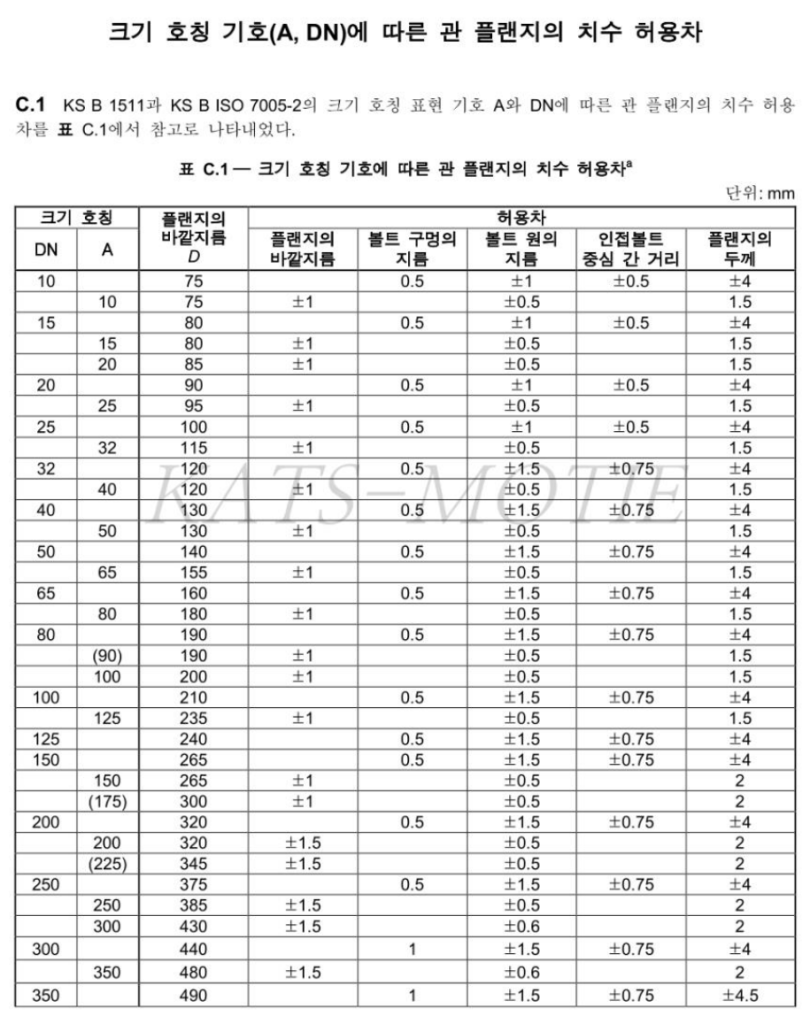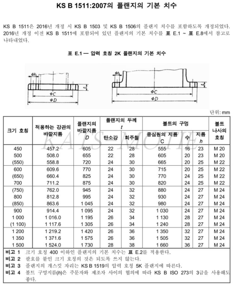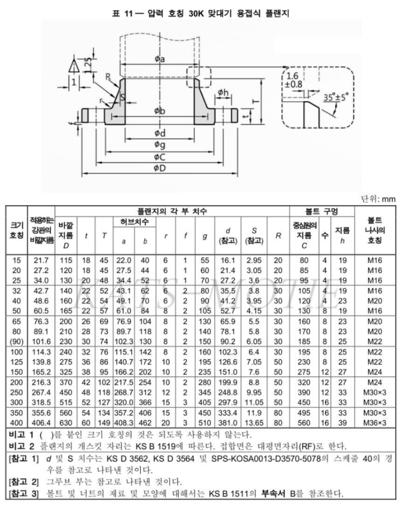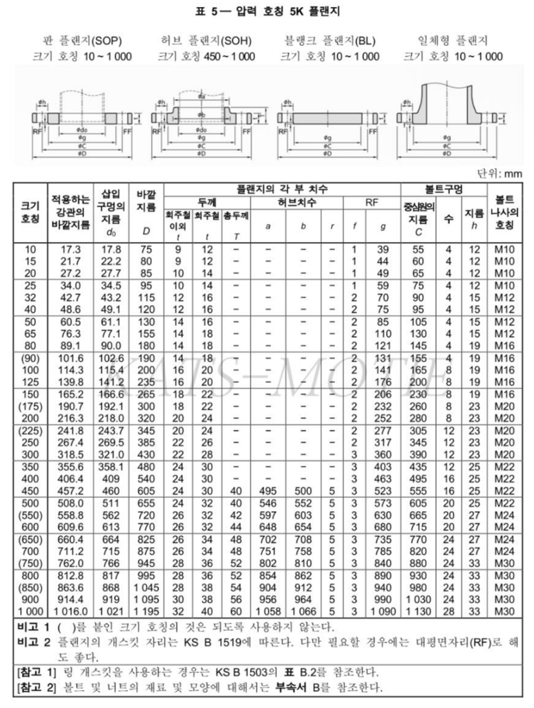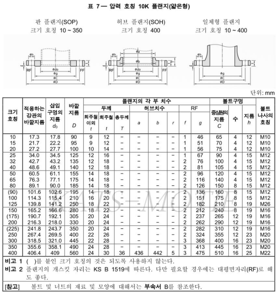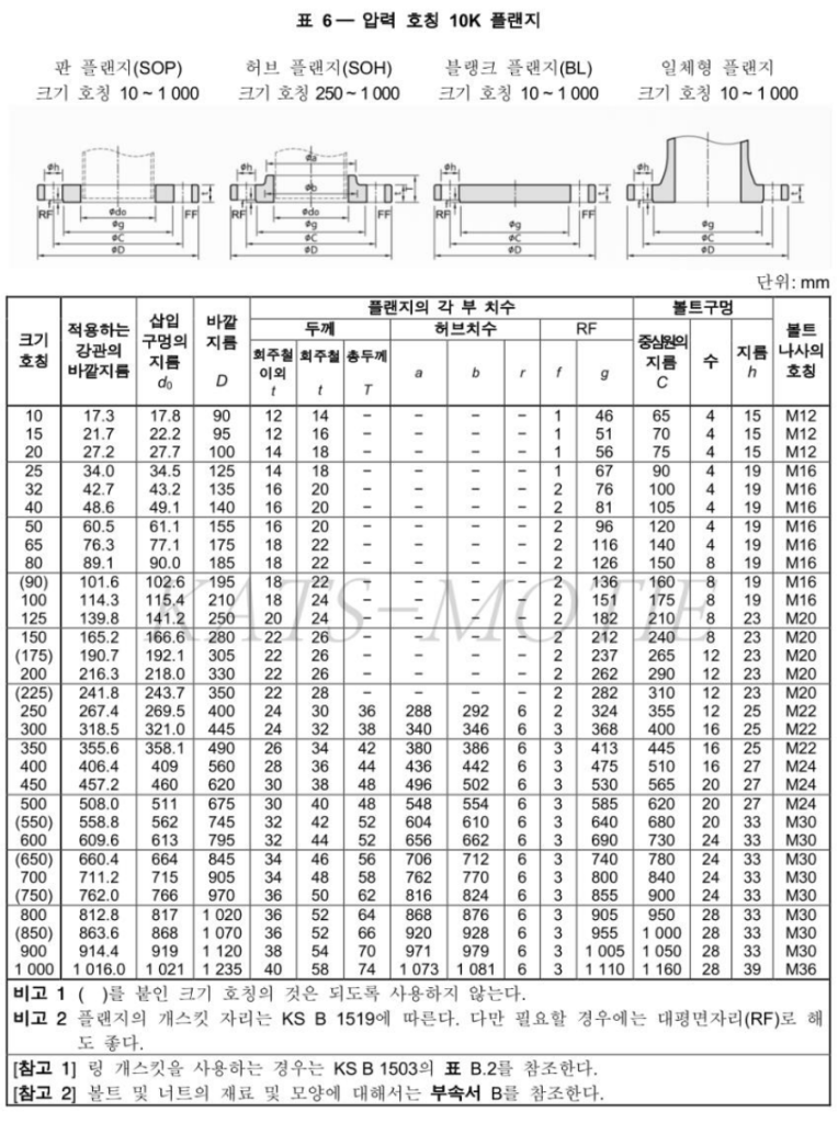 이 표준은 증기ㆍ공기ㆍ가스ㆍ물ㆍ기름 등의 일반용 배관에 사용하는 관ㆍ밸브 등을 접속하는 압력 호칭 2 K, 5 K, 10 K, 16 K, 20 K 및 30 K의 철강제 관플랜지의 기본 치수 및 치수 허용차에 대하여 규정