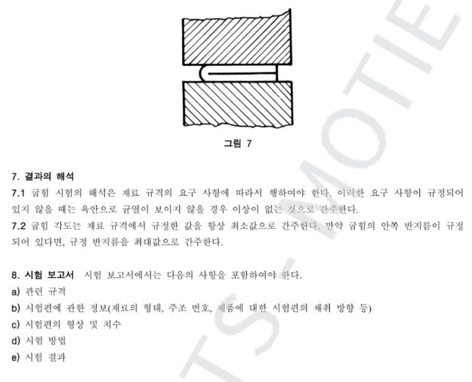 이 규격은 1985년에 제1판으로 발행된 ISO 7438 Metallic materials-Bend test 를 기초로 하여, 기술적 내용 및 규격서의 서식을 변경하지 않고 작성한 한국산업규격이다. 이 규격은 종래의 한국산업규격 KS B 0803:1977 금속 재료 굽힘 시험편 및 KS B 0804:1977 금속 재료 굽힘 시험 방법을 대체한다.