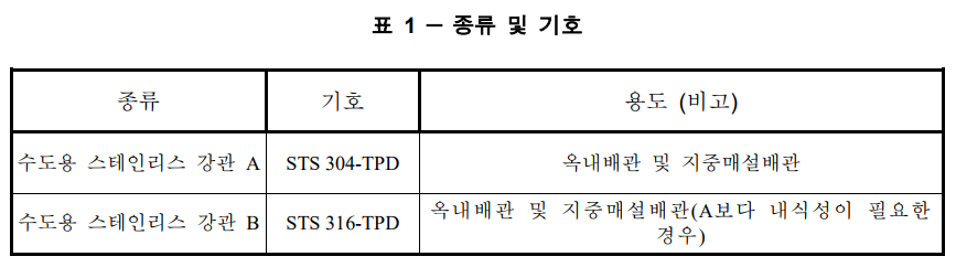 이 표준은 수도에 사용하는 스테인리스 강관에 대하여 규정한다.