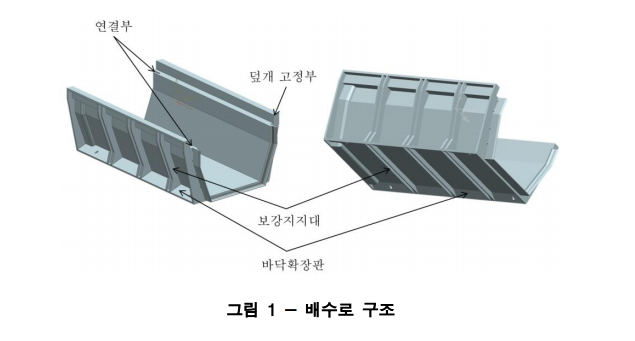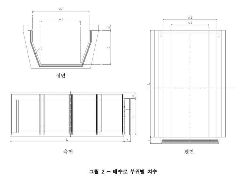 배수로의 부위별 치수 및 허용차는 그림 2 및 표 1에 따른다.