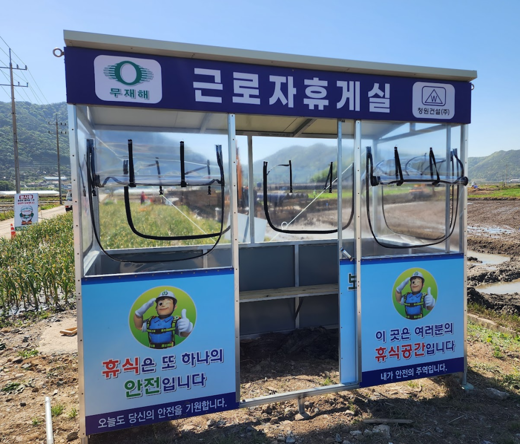상수도 공사의 특성상 잦은 이동으로 인해 제작되어 판매중이거나 규격에 맞춰 제작할 경우 많은 사람을 동원하여 이동하거나 장비를 이용하여야 함에 이에 따른 불편함이 있다. 그래서 감리나 발주처와의 협의를 통해 캐노피를 이용하거나 파라솔 과 테이블, 의자를 이용하여 근로자 휴게실을 대체할 수 있다.