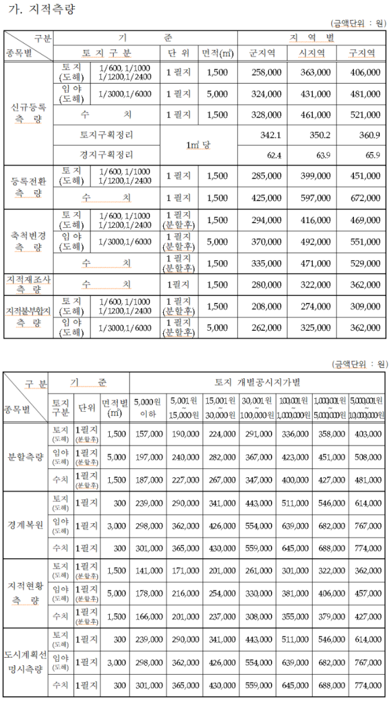 | 지적현황측 량 | 토지(도해) | 1필지(분할후) | 1,500 | 141,000 | 171,000 | 201,000 | 261,000 | 301,000 | 322,000 | 362,000 |