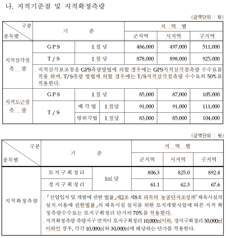 | 축척변경측 량 | 토지(도해) | 1/600, 1/10001/1200,1/2400 | 1필지(분할후) | 1,500 | 294,000 | 416,000 | 469,000 |