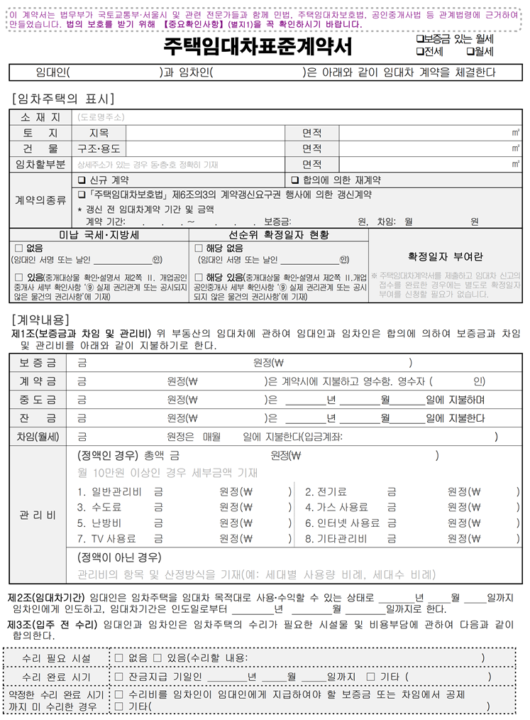 주택임대차표준계약서 게시일: 2024년 10월 15일업데이트 날짜: 2024년 10월 15일게시자: HG카테고리:07.양식 일을 하다 보면 접하게 될 주택임대차표준계약서 입니다. 다운로드 법무부 : 주택임대차표준 (변경확인) 아래 다운로드 주택임대차표준계약서(원본게시용).PDF 주택임대차표준계약서(사용용).HWP HG heygaso.synology.me