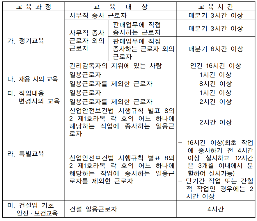 (1) 계약상대자(안전보건관리 책임자)는 당해 사업장의 근로자에 대하여 고용노동부령이 정하는 바에 따라 안전교육계획을 수립하여 실시하고, 그 결과는 교육일지에 작성, 보존하여야 하며 안전교육 내용은 아래 표와 같다.