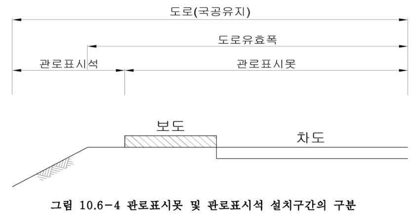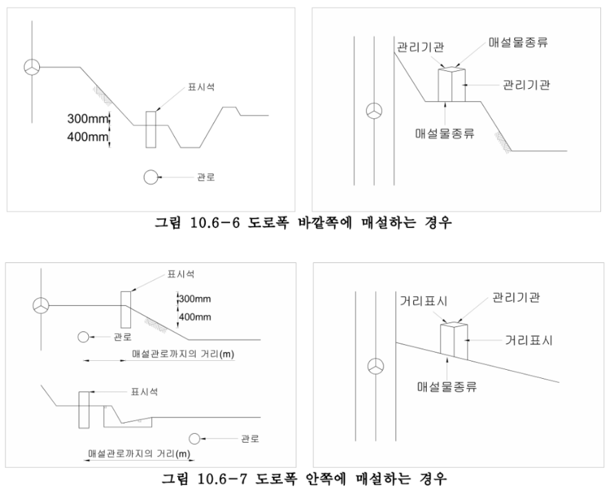 나. 관로표시석은 도로유효폭 바깥쪽에 매설하는 경우에는 매설관로의 중앙직상부에 설치하며 도로측에서 매설물의 종류와 관리기관명을 볼 수 있도록 도로와 대각선 방향으로 설치한다. 도로유효폭 안쪽에 매설하는 경우에는 길어깨끝 또는 절토부 소단에 설치하며, 도로측에서 매설물의 종류와 거리표시를 볼 수 있도록 도로와 대각선 방향으로설치한다. (아래 : 그림 10.6-6, 그림 10.6-7)