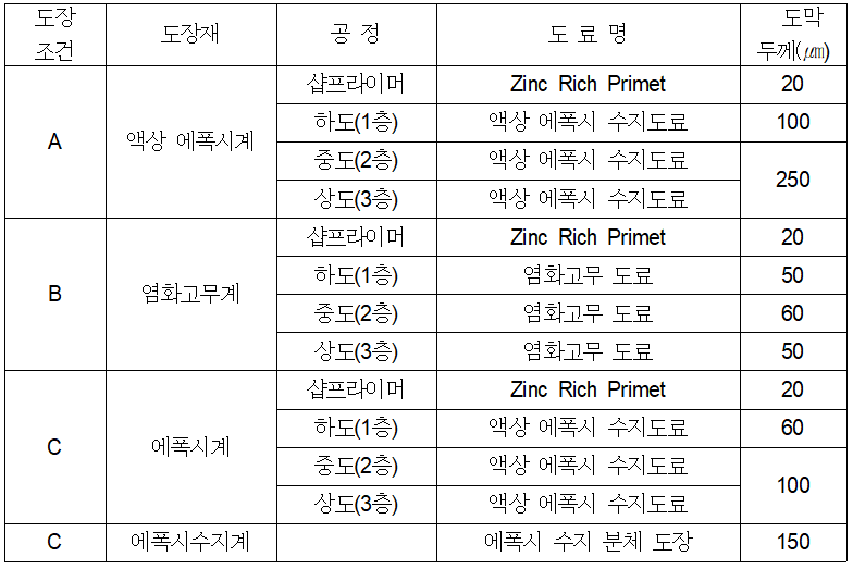 (2) 계약상대자는 설비의 운반, 현장 설치 및 용접 후 손상된 도장부위의 마감(touch-up)도장 및 보수도장을 아래와 같이 하여야 하며, 설비제작자는 이에 필요한 도료를 공급하여야 한다.