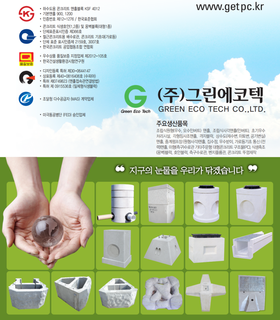 (주)그린에코텍 (카다로그) : PC맨홀 제작 게시일: 2024년 07월 13일업데이트 날짜: 2024년 09월 10일게시자: HG카테고리:05.공급원승인/카다로그 그린에코텍 프리케스트 제품 지명원_카다록다운로드 HG heygaso.synology.me