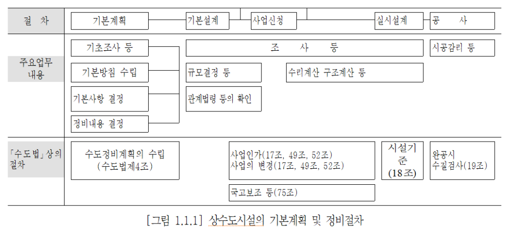 또 상수도시설의 설계는 관련되는 법령이나 기준에 부합해야 하는 것은 물론이고 상수도시설이 토목․건축․기계․전기․계측제어 등의 각 분야에 걸치는 기술로 구성된 종합시스템이므로 전체로서 조화된 시설이 되도록 하는 것이 바람직하다. 상수도시설의 기본계획으로부터 설계와 공사에 이르기까지 일반적인 흐름은 다음 [그림 1.1.1]과 같다.