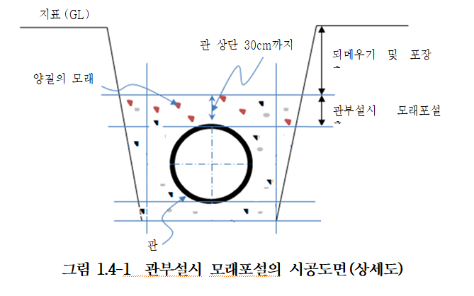 (3) 관부설시 모래포설은 당해공사의 관로 터파기 구간에 되메우기 재료로 모래를 사용하여 터파기 전의 상태로 원상 복구하는 것을 포함하여 적용한다.