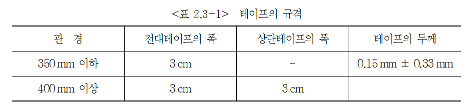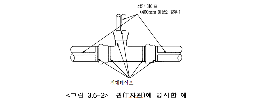 ⑵ 직경 350mm 이하의 관은 전대테이프만으로, 직경 400mm 이상의 관은 전대테이프와 상단테이프로 표시한다.